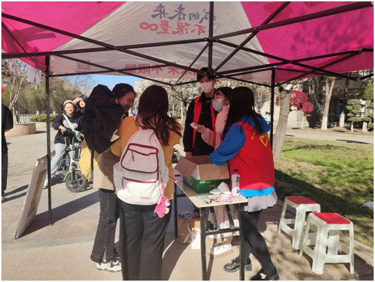 我们青协在樱花大道旁进行摆点活动,上午8:30-11:30和下午2:30-5:30是每日的活动时间段,志愿者们的身影为这美好的春日景图锦上添花。志愿者们在樱花树下宣讲关于樱花的知识或小故事,并在宣讲过程中引导参加者互动问答游戏。让大家不仅欣赏了美丽的樱花,而且还会获得意料之外的小知识,对于参与活动的同学,志愿者们还会发放有关樱花的明信片以及樱花味的小零食。
