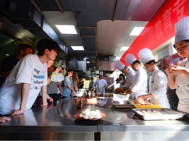 学生毕业后,有的成为烹饪大师、餐饮总监、酒店高级职业经理人,有的成为中职、高职、应用型本科院校烹饪专业教师,有的成为专职公共营养师、健康管理师、食品安全管理师,还有的考研、考公、考编后成为国家相关部门公务员。在参观时,热火朝天的操作间成了新生和家长最欢迎的地方。当羊排、冰淇淋、松鼠鳜鱼、外形酷似梨子的面点出炉时,大家的动作很整齐:用筷子夹起来,往嘴里送。这些食物都是学院的老师和学生们制作的,这场“好吃”的迎新会,也给新生和家长们留下了深刻的印象。同时由行业大师和基地教师的绝活展示也精彩纷呈。