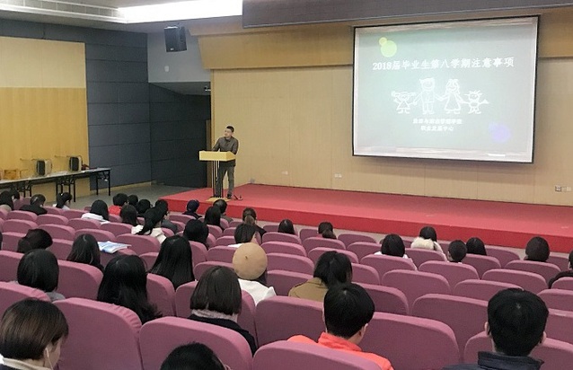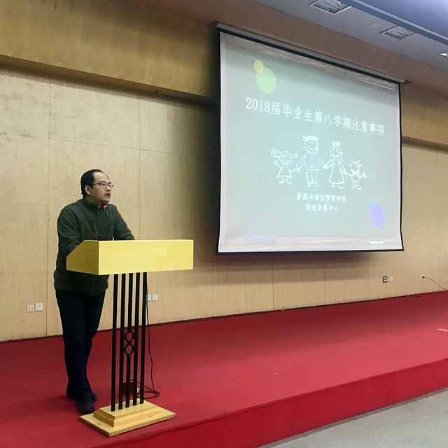 (通讯员:陈瑶、齐振英)2017年12月27日上午十点,大学生活动中心二号报告厅举行旅游学院2018届全体毕业生集中大会。旅游学院副院长谭志国、党委副书记孔军、毕业班班主任、全体辅导员、2018届全体毕业生参加大会,会议由就业工作专职人员陈瑶主持。