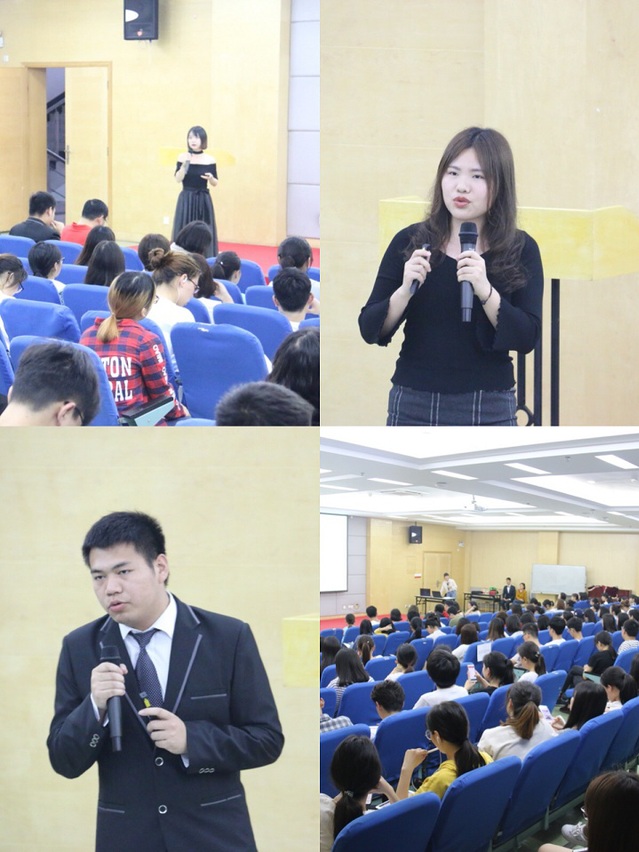 王紫阳和刘博作为旅游管理本专业考研成功的学生代表,分别就自己考研学校确定、备考科目复习、备考阶段划分等诸多注意事项进行了解说,关于英语、数学、政治以及专业课的学习提出了自己的见解,对于自己在备考过程中的心灵历程也进行了一定的分享。杜敏和唐阿灵针对跨考也进行了考研分享与交流,在时间布局上也提出了自己的看法,两人切实且诙谐的言语抓住了在场观众的心。四位同学的分享中,大家都提到只要信念坚定,明确自己的考研目的、合理规划自己的考研安排,考研必定会成功。