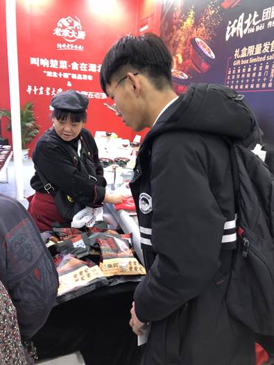 到达展馆后,同学们便积极地到各个展区观看,认真了解每个展板所承载的楚菜文化,透过宣传画、宣传册以及现场的展示,品尝每个地方独具特色的美食文化。有的同学驻足在楚地酒展柜前,认真聆听工作人员的讲解,品悟这传承千年的荆楚酒文化;也有同学停留于茶展台观赏茶艺识辨各色茶叶,在木桌旁小憩细品楚地之茶;值得一提的是独具特色的黄陂三鲜、荆州鱼糕、天门蒸菜、潜江小龙虾等一系列美味,成功地吸引了不少同学的目光。大家既饱了眼福也饱了口福,通过品尝舌尖上的楚味,更深层次地了解了楚菜的博大精深、源远流长。