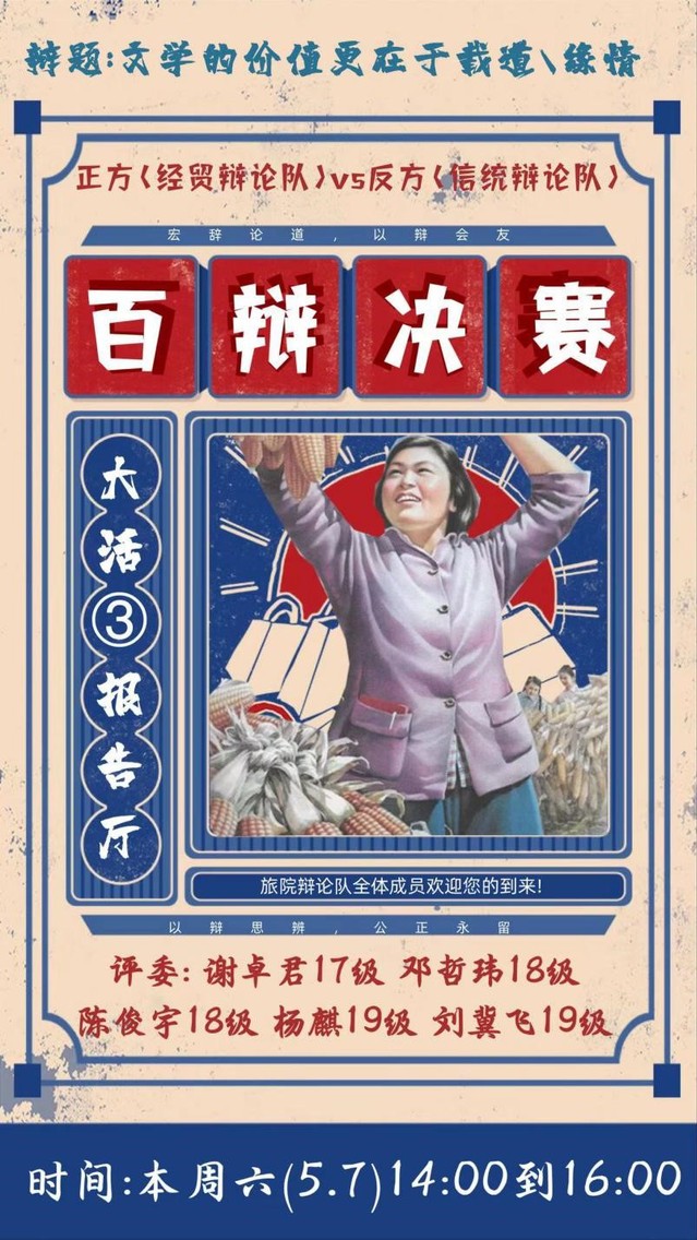 决赛中,正方持观点为“文学的价值更在于载道”,反方持观点为“文学的价值更在于缘情”。正方辩手一开始便旗帜鲜明的提出了应该从创作者的视角来看待这个辩题,并提出了文以载道更能带来文学创作价值的观点,而反方也针锋相对的提出应该从阅读者的角度来看待辩题,经过双方激烈的唇枪舌战,在正方四辩激昂的总结陈词后,整场比赛画上了最后的句点。